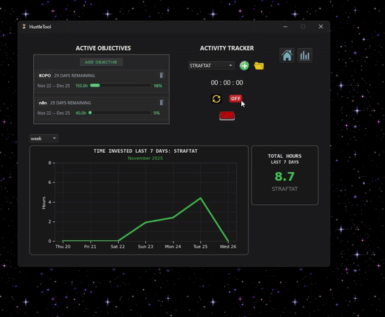 HustleTool is a desktop widget that shows exactly how you spend your time on your computer.Set objectives, monitor your progress in real-time, and build a visual history of your work.